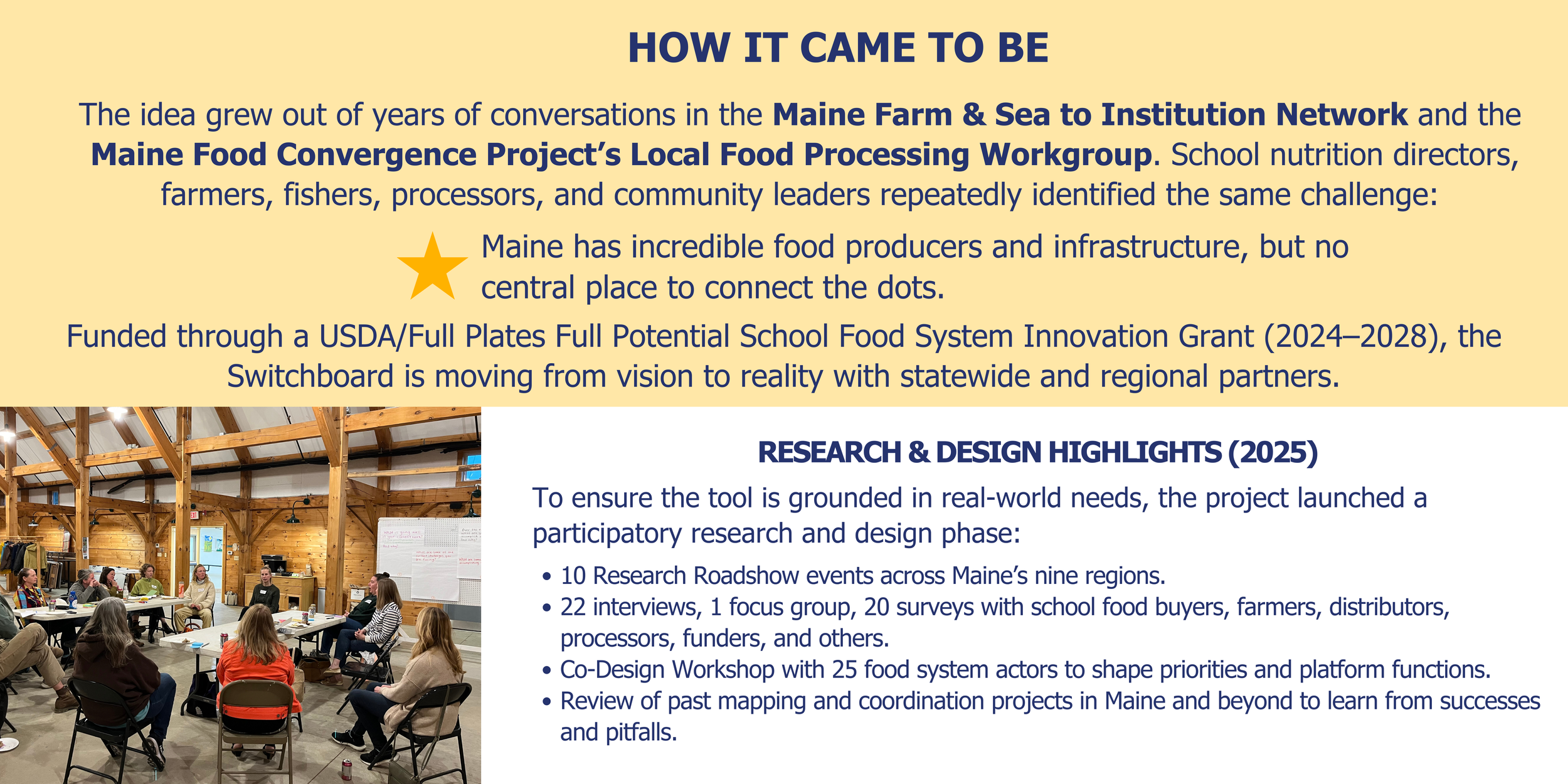 The Local Food Switchboard is a food supply chain coordination platform that helps people across Maine’s food system work together to buy and sell local food more easily. By shifting from competition to coordination, the Switchboard encourages collaboration, transparency, and community-building. It provides support including infrastructure, technical assistance, and access to institutional markets especially for producers and processors who have faced systemic barriers to capital and market access. The Switchboard creates reliable sales channels, new market connections, and a more equitable, resilient, and relationship-based food system for Maine.